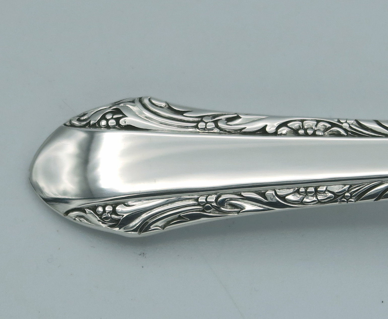 The Chased Romantique sterling silver pattern is by Alvin and designed by F Russell Woodward in 1933. The pattern has a mirrored finish in the center going from top to bottom with a band of very intricate designs on both sides. The style would work well with both mid-century and more modern table settings. White Water Antiques has a selection of antique and vintage patterns in sterling and silver plate.