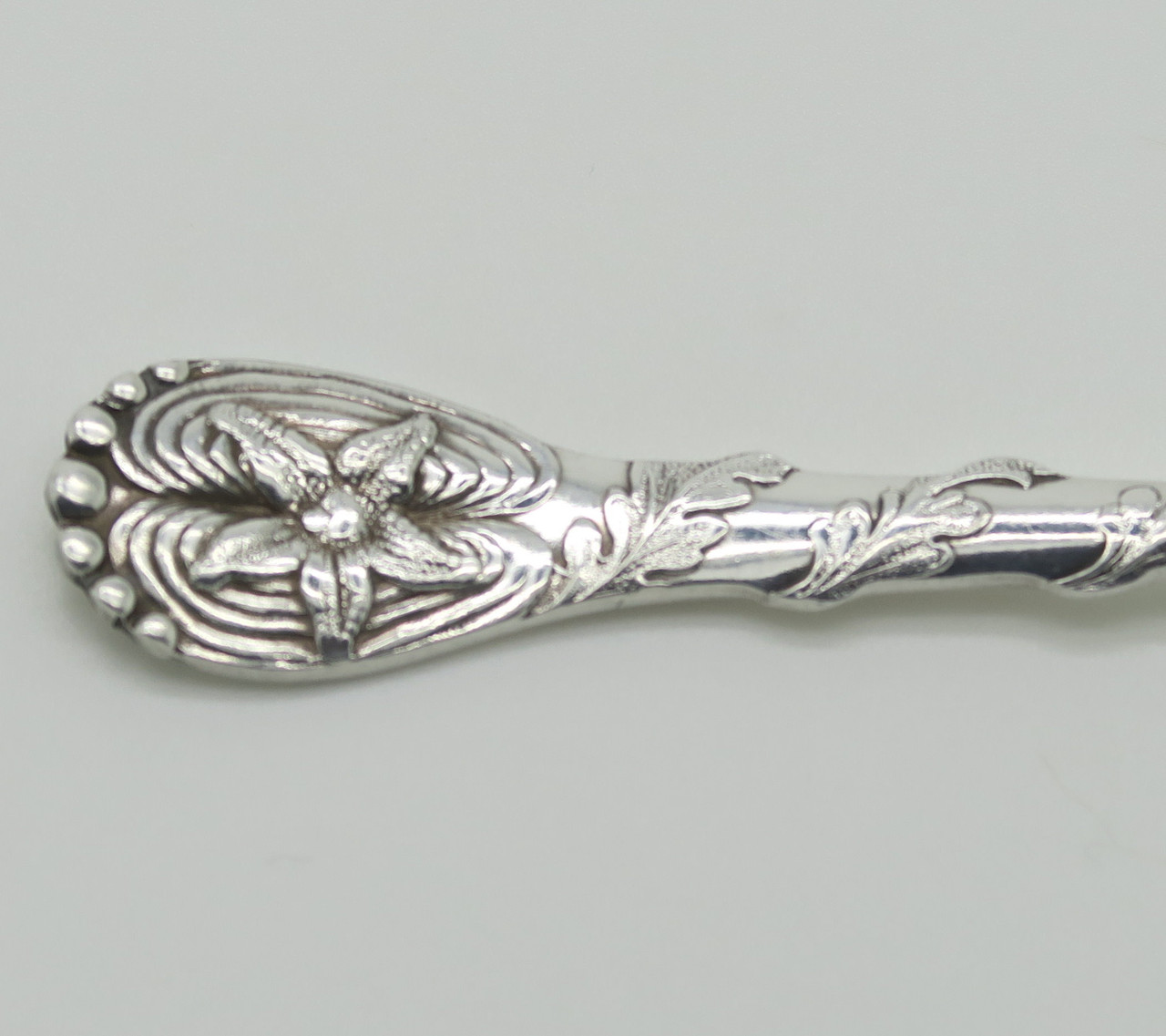 Rogers created this pattern in 1892. Items in this pattern are rarer and hard to find. The Art Nouveau style is obvious. At the top of the pattern is a starfish with seaweed trailing down the handle. The back of the pattern features a crab at the top. If you are looking to accent a seaside décor this this is the pattern.