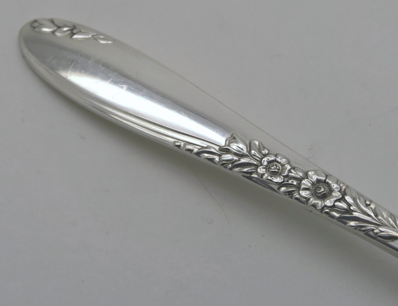 Country Lane was introduced in 1954 by Wm A Rogers / Oneida and was subsequently discontinued. This pattern features flower blossoms in the handle center as well as a single stem flower near the handle top. The mid-century vintage silverplate pattern has a lot going for it for dining decor.