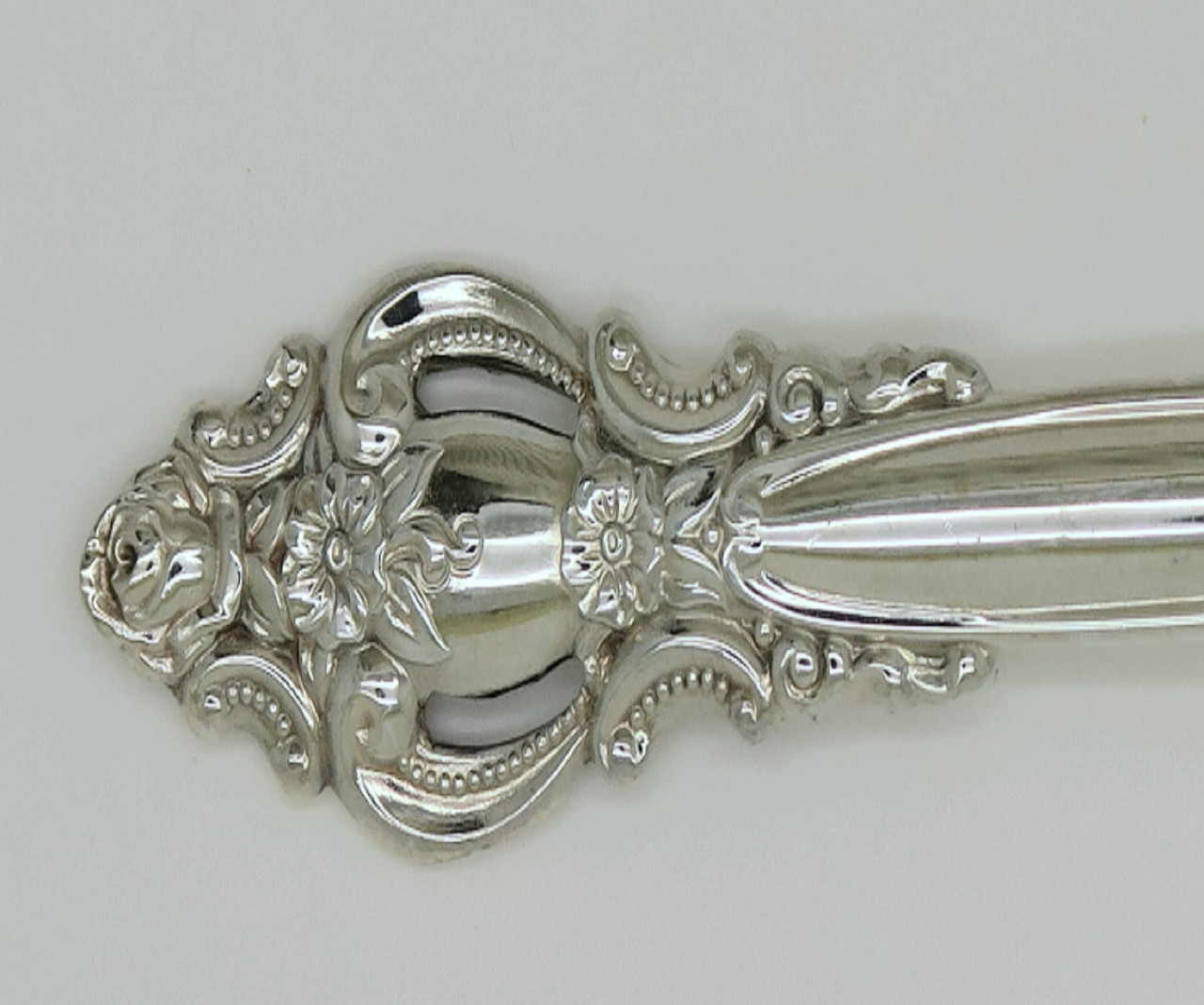 Empress by International was introduced in 1981 and discontinued in 1990. The classic design with pierced handle is reminiscent of mid-century patterns. Each piece of silverware is back stamped International Silverplate.