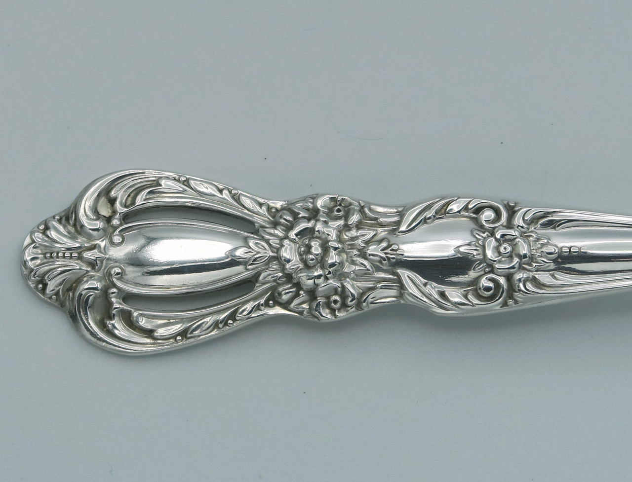 Grand Heritage pattern by 1847 Rogers Bros silver plate International was introduced in 1968 and was discontinued in 1988. The design is best described as a rich and classic look. Most of the tableware pieces (not the knives) feature a pierced handle. Silverware pieces in this pattern have a nice weight and feel to them. What a great choice in silverware when redecorating your dining experience. White Water Antiques is proud to present this and many other vintage patterns.