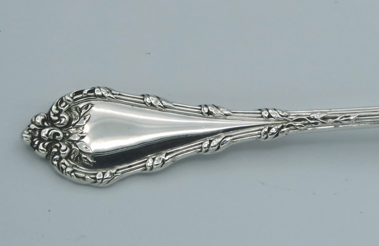 Madame Royale by Durgin was patented in 1897 and discontinued in 1991. The geometric line work is enhanced by natural elements of leaves. This early pattern is an eye-catcher on any table and Durgin is one of the top manufacturers of the time. White Water Antiques brings a combination of design, vintage elegance and art to your table.