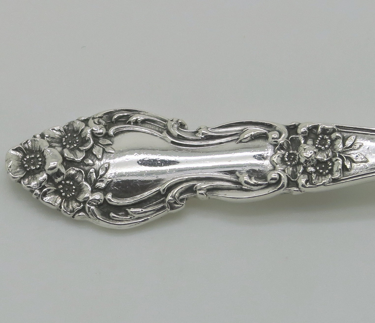 Meadow Rose sterling was introduced in 1907 by Wallace Sterling. The pattern concentrates on meadow roses at the top and center of the pattern tied together by classic scroll work. This pattern will blend with most classic and traditional dining decor. Thank you from White Water Antiques.