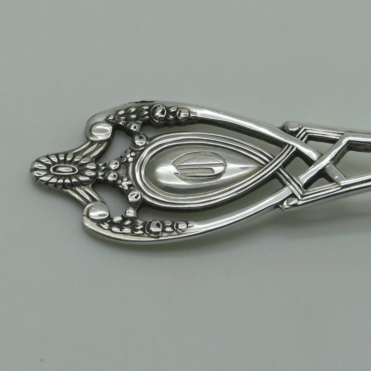 This pattern features cut-outs and open work with a classic shield look. Done by Lunt. Rogers, Lunt and Bowlen started in Greenfield MA. and had a showroom on Madison Avenue in New York. The Monticello pattern was introduced in 908 and discontinued in 1997.