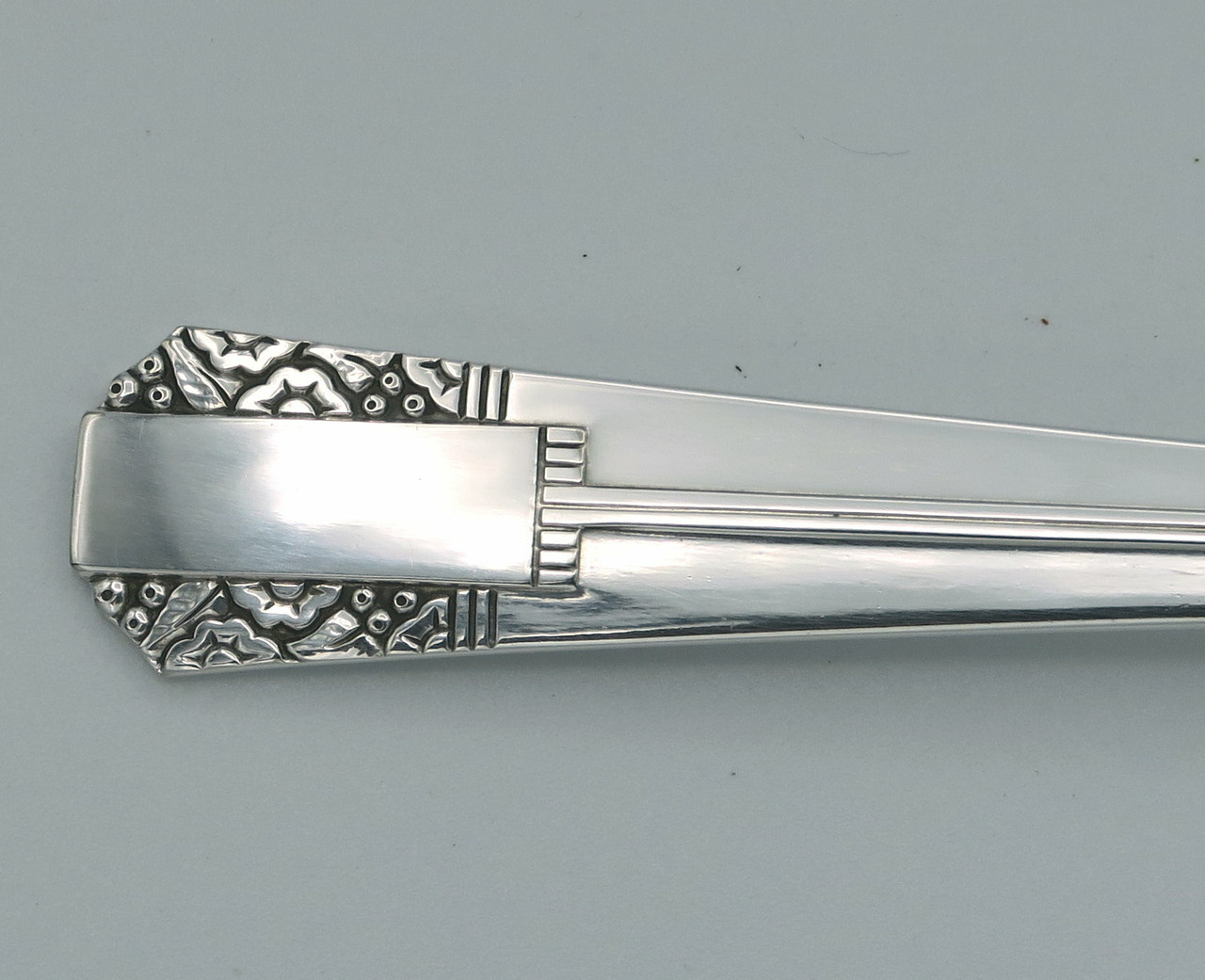 Park Lane by Wm A Rogers / Oneida was introduced in 1936 and has been discontinued. The center deco graphics is highlighted by a floral border. It is hard to believe this pattern is so vintage since it will fit in with retro styles of today.