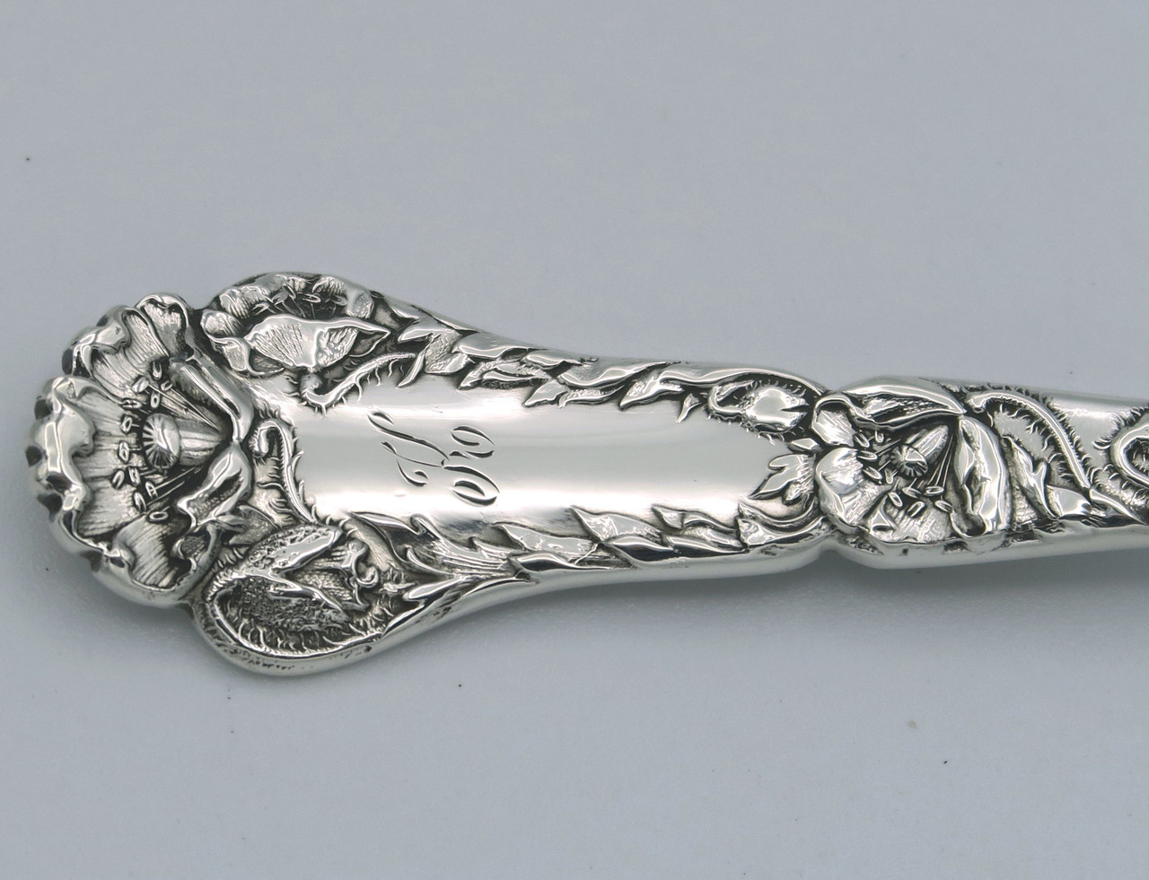 Poppy sterling silver pattern by Gorham was introduced in 1902 and subsequently retired. The silverware pattern has poppy buds and vines leading to the large poppy blossom at the top. This is an intricate and well executed design that is very collectible. White Water Antiques offers antiques and vintage flatware in both sterling and silverplate.