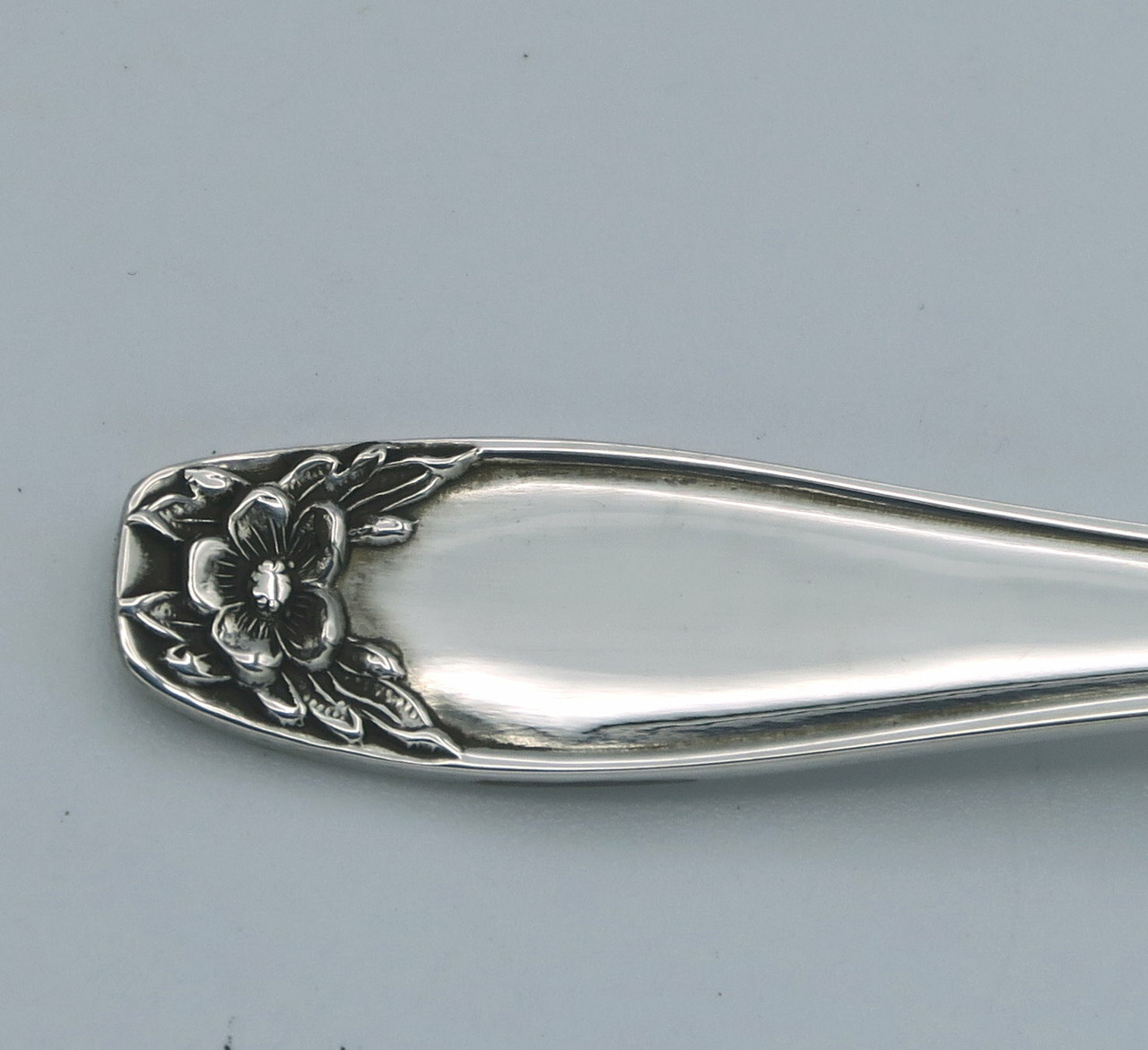 Puritan sterling silver pattern by Kirk Stieff was introduced in 1922 and discontinued in 1991. The simple pattern is highlighted by a single blossom at the top.